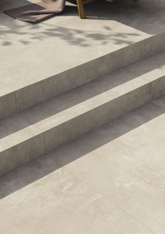Die 6 mm und 8 mm starken Oberflächen für Innenräume schaffen in Kombination mit den 20 mm starken Feinsteinzeug-Lösungen für Außenanlagen optisch nahezu fließende Übergänge zwischen Innen- und Außenbereichen.