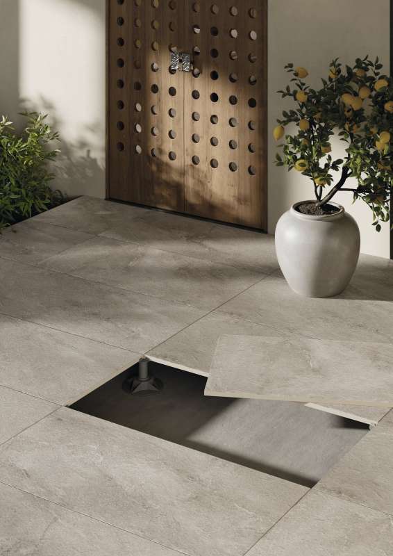 Unter der Feinsteinzeug-Oberfläche entsteht ein leicht zugänglicher Hohlraum, ideal für die Verlegung von Installationen und Rohrleitungen.
